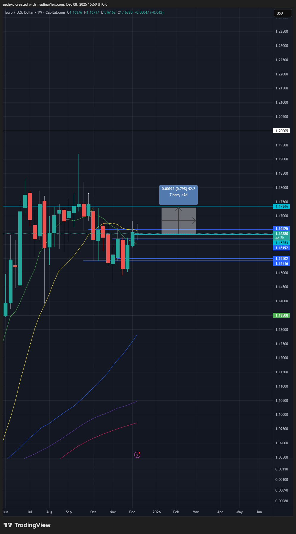 Dentro de mi idea, me inclino a la posibilidad de que el factor de seasonality de diciembre que tiende a favorecer un dólar más debilitad, junto con el corte de la Fed y la inclinación del Banco de Europa a haber detenido el ciclo de alzas de intereses, nos podría llevar por encima de 1.17 rumbo a 1.18.