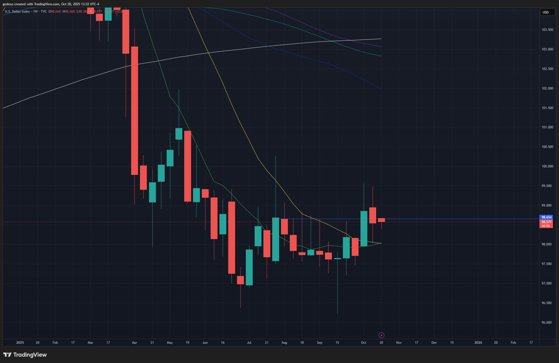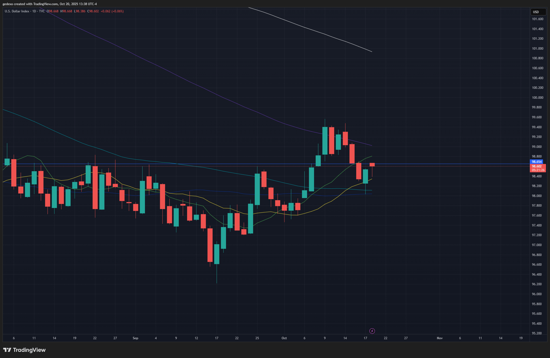 El Dollar Index se estabiliza alrededor de los 98.500, después de rebotar desde la base de los 98.000 puntos, nivel que marcó la zona de ruptura del último rally.