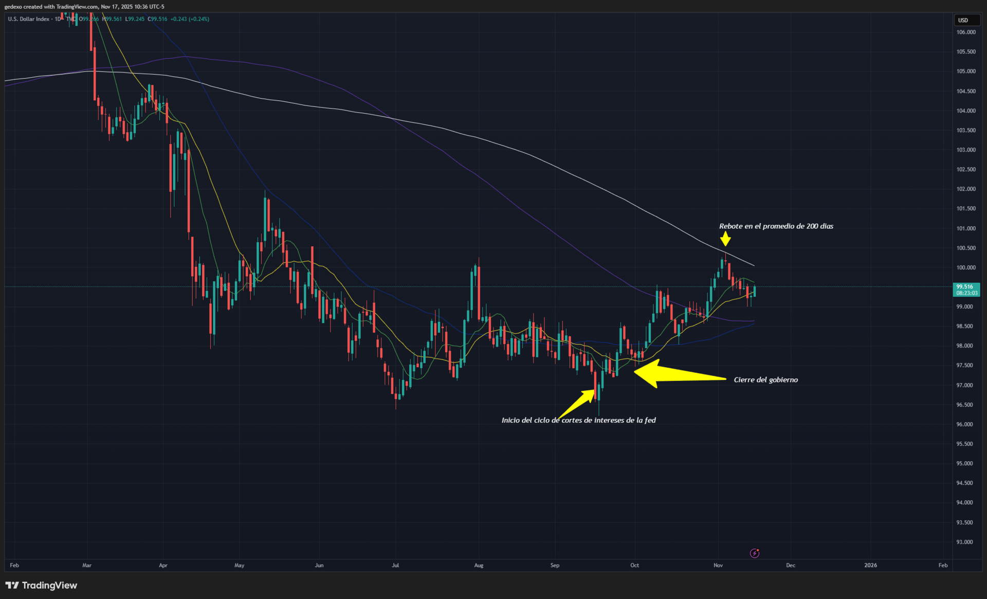 Durante el blackout estadístico, el mercado operó sin brújula. El USD perdió dirección, no por debilidad macro, sino por ausencia de señales. De hecho, el dólar tuvo sus mejores semanas de fuerza desde que la FED comenzó a cortar los intereses, incluso invalidando el patrón histórico donde el dólar se debilitaba tras el cierre del gobierno. En esta ocasión nos sorprendió dando un retroceso al promedio de 200 días, todo durante el shutdown. Aunque vimos rallies sin fundamentos, esto fue un buen recordatorio de que los mercados prefieren desafiar las narrativas cuando tienen la oportunidad.