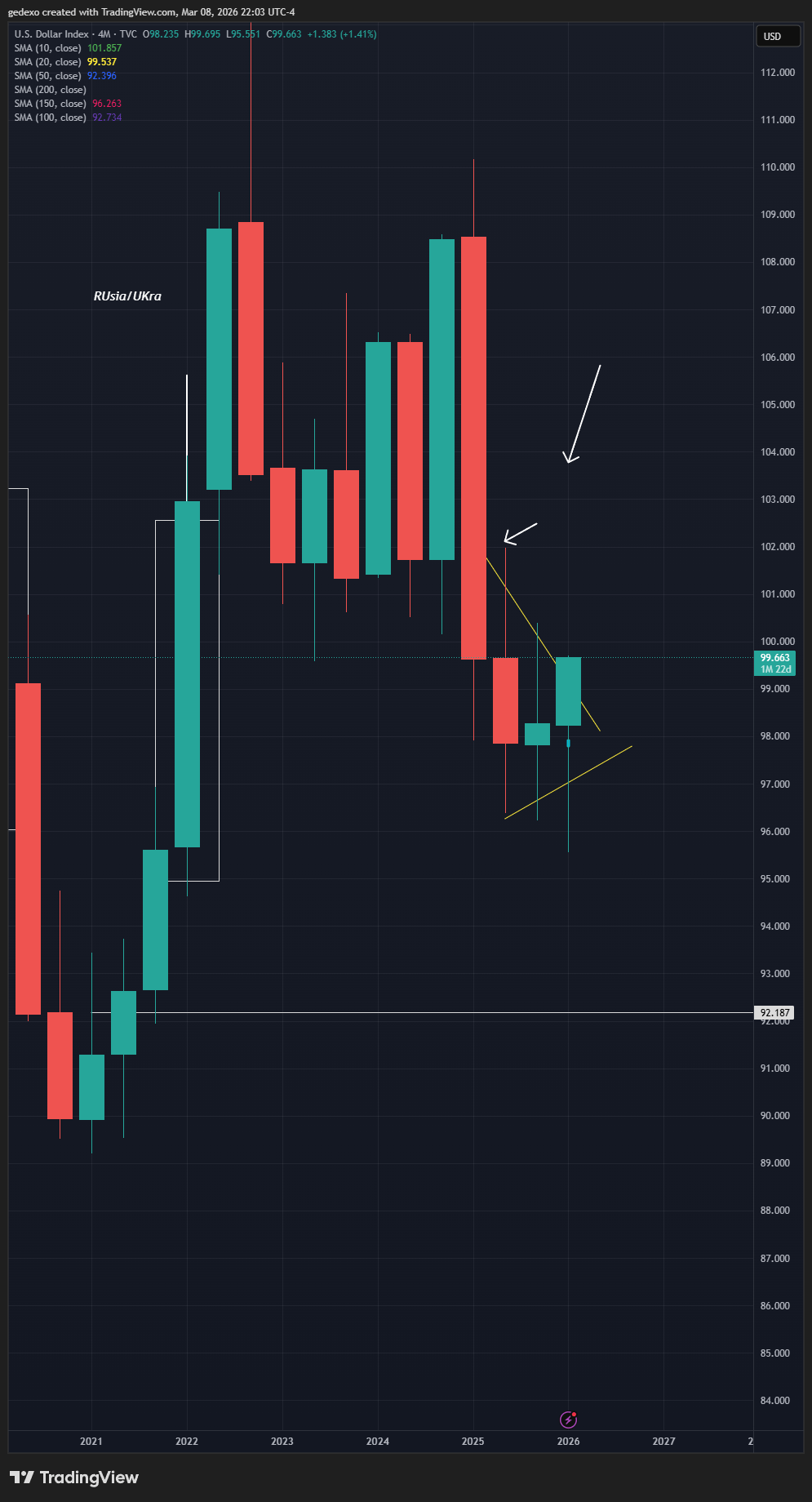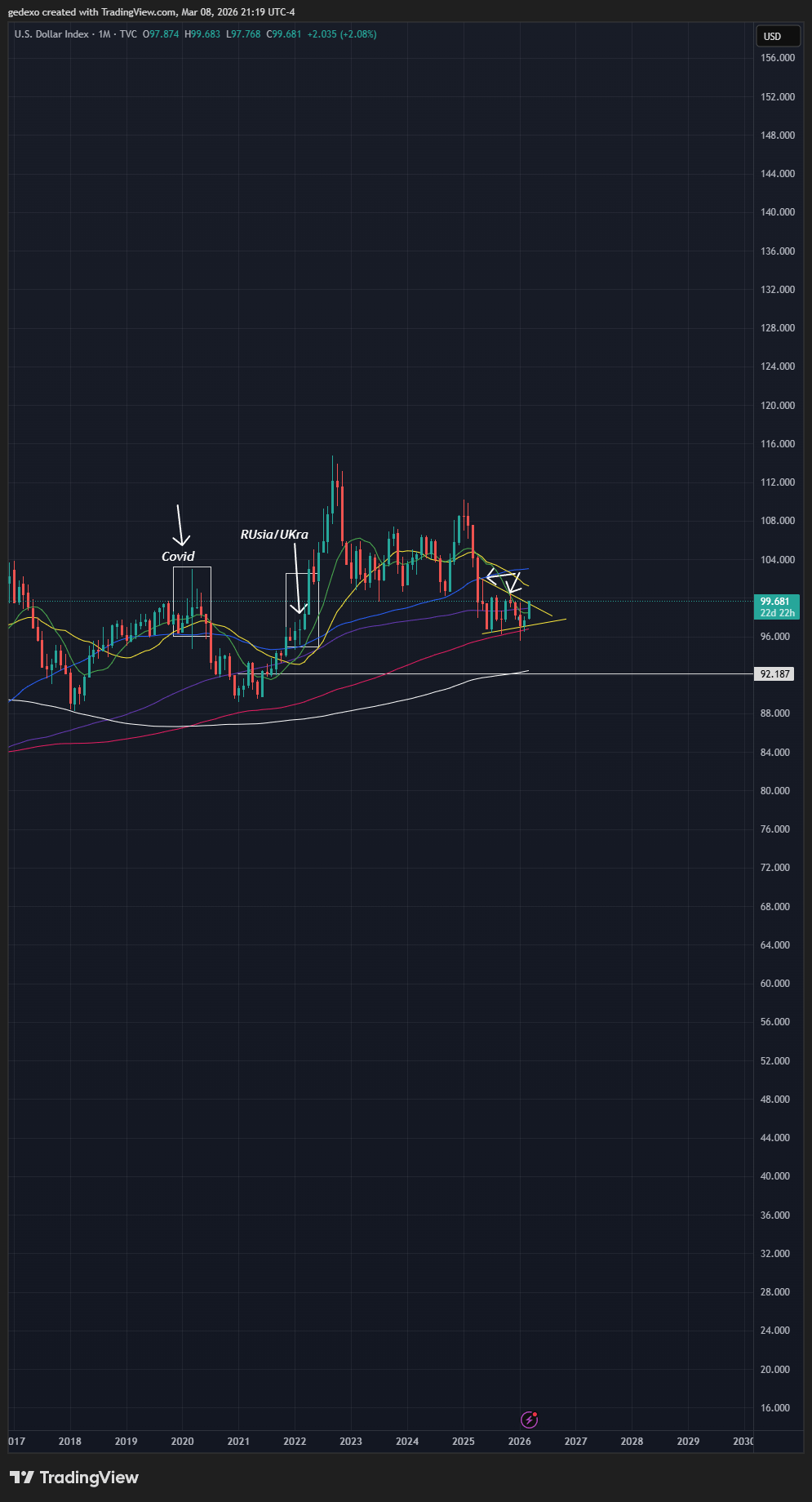 Estos Rectángulos que tienes marcado en el gráfico fueron los ciclos del dólar durante el COVID y la guerra de Ucrania.